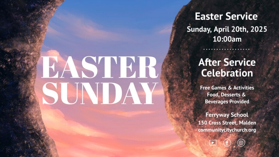 Join us for Easter service on Sunday, April 20th, 2025, from 10am-11:30am. We are located at the Ferryway School at 150 Cross Street, Malden, MA. Kids City, our children’s ministry, meets during service and is available for children ages 0-5th grade. Free parking in the school parking lot is available on Walnut Street.