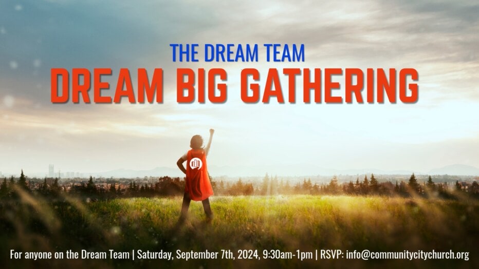 This Dream Team Dream Big Gathering will be on Saturday, September 7th, from 9:30am-1pm, at the Ferryway School. This will be a time where we will cast vision, seek God and pray for the upcoming year, eat together, plan in ministry teams, and connect and have fun with each other. We look forward to having you join us and celebrating what God has been up to and will continue to do as we gather together with you! Please email at info@communitycitychurch.org to RSVP so that we can plan for food and our time together.