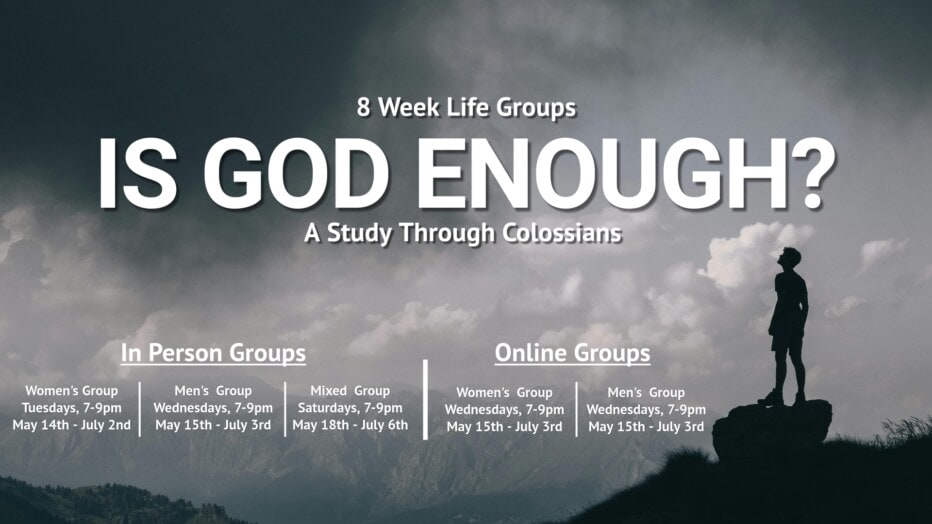Our next round of Life Groups begins the week of May 12th, 2024 and will go for 8 weeks. We have various groups that meet throughout the week. During this round of Life Groups, we will be diving deeper into our sermon series called: Is God Enough? A Study Through Colossians. We encourage everyone to commit to joining a Life Group.